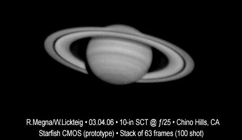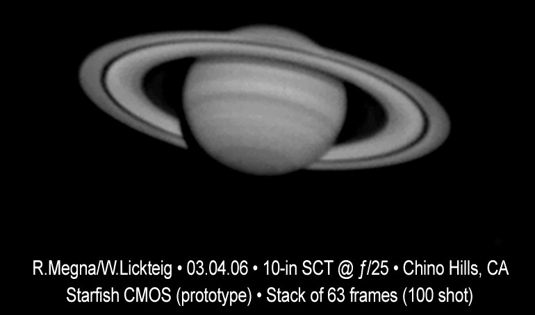 Ralph Megna and Walt Lickteig are two amateur astronomers that have recently joined our beta test group. They have been ardent planetary imagers for some time and have spent some time trying out the Starfish (Monochrome) Camera on one of my favorite subjects - Saturn. Above is the results of their first imaging session and some of Ralph's comments about the camera: "Here is our first light image of Saturn. What blows me away about this image is that it is a stack of only 63 frames. Its smoothness and detail would normally require 250+ frames from a webcam. The seeing was a big help — there are very, very few nights when you can use two out of three frames shot — but the extraordinary lack of noise from the camera was a major factor, too. With scope collimation perfectly tweaked and the ability to capture more images in a shorter time, I think this camera could do some amazing planetary imaging (god, I wish I could have used it this past fall on Mars!)." Ralph |